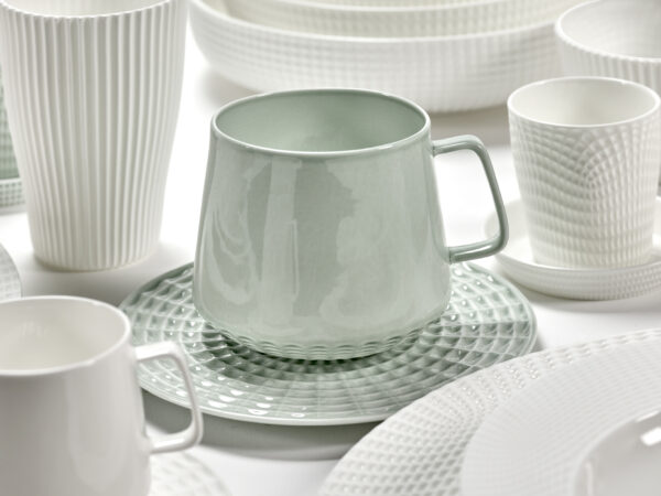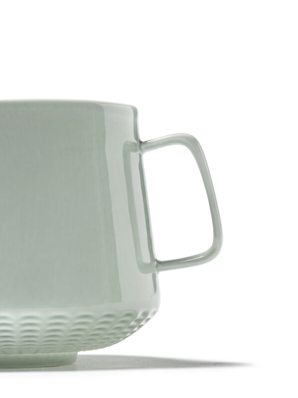 This large cappuccino cup is a pleasure to hold thanks to the delicate porcelain from which it has been made. The cup has been finished with a traditional jade green celadon glaze. Designer Ann van Hoey felt that this was a perfect match for the design of Nido which mixes and matches old and new.