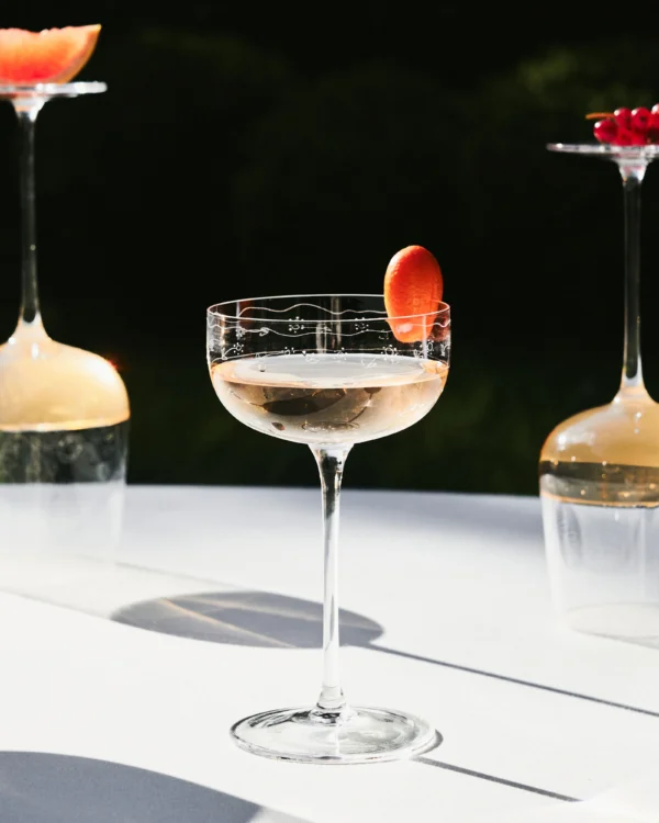 Besides a porcelain dinnerware and coffee set, Midnight Flowers – Italian fashion house Marni’s first tableware collection – also comprises 5 refined glasses: a water glass on a small base, a champagne coupe and flute, and wine glasses. Each glass features a laser-engraved flower motif. This labor-intensive process is repeated three times for an optimal effect. Finally, the glass is finished with an oil-based polish to enhance the subtle transparency of the engraved motif. The result is an artistic set of glasses worthy of the renowned fashion house.