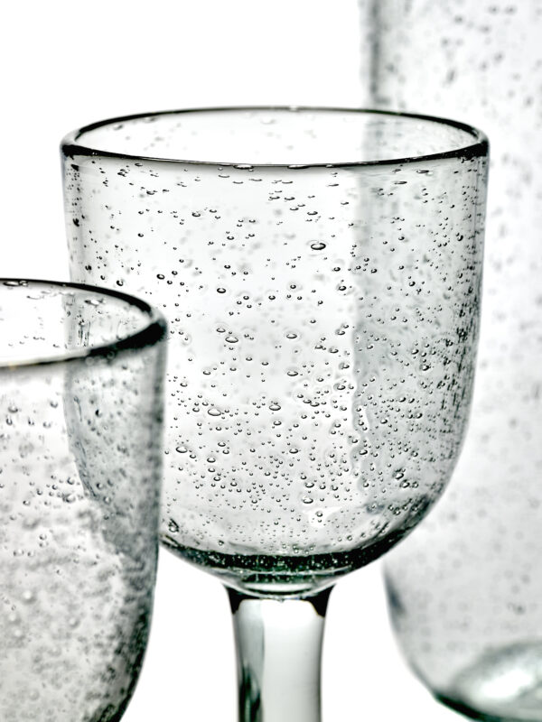 Red wine glass with transparent air bubbles. A blend of rugged shape and refined looks creates unique light plays. This glassware is part of the Pure collection by Pascale Naessens.